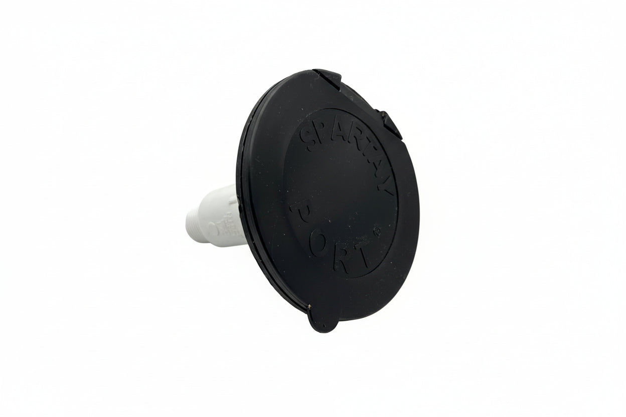 A 3-5/8" non-potable sprayer port engineered for exterior shower systems on Interstate 19X, 24X, and Rangeline models. This component isolates non-potable water flow for external cleaning tasks, allowing you to rinse gear and equipment without depleting freshwater reserves. The black finish integrates with factory exterior plumbing configurations. Direct replacement ensures compatibility with your Airstream's original specifications and maintains system integrity during routine maintenance and campsite operations.