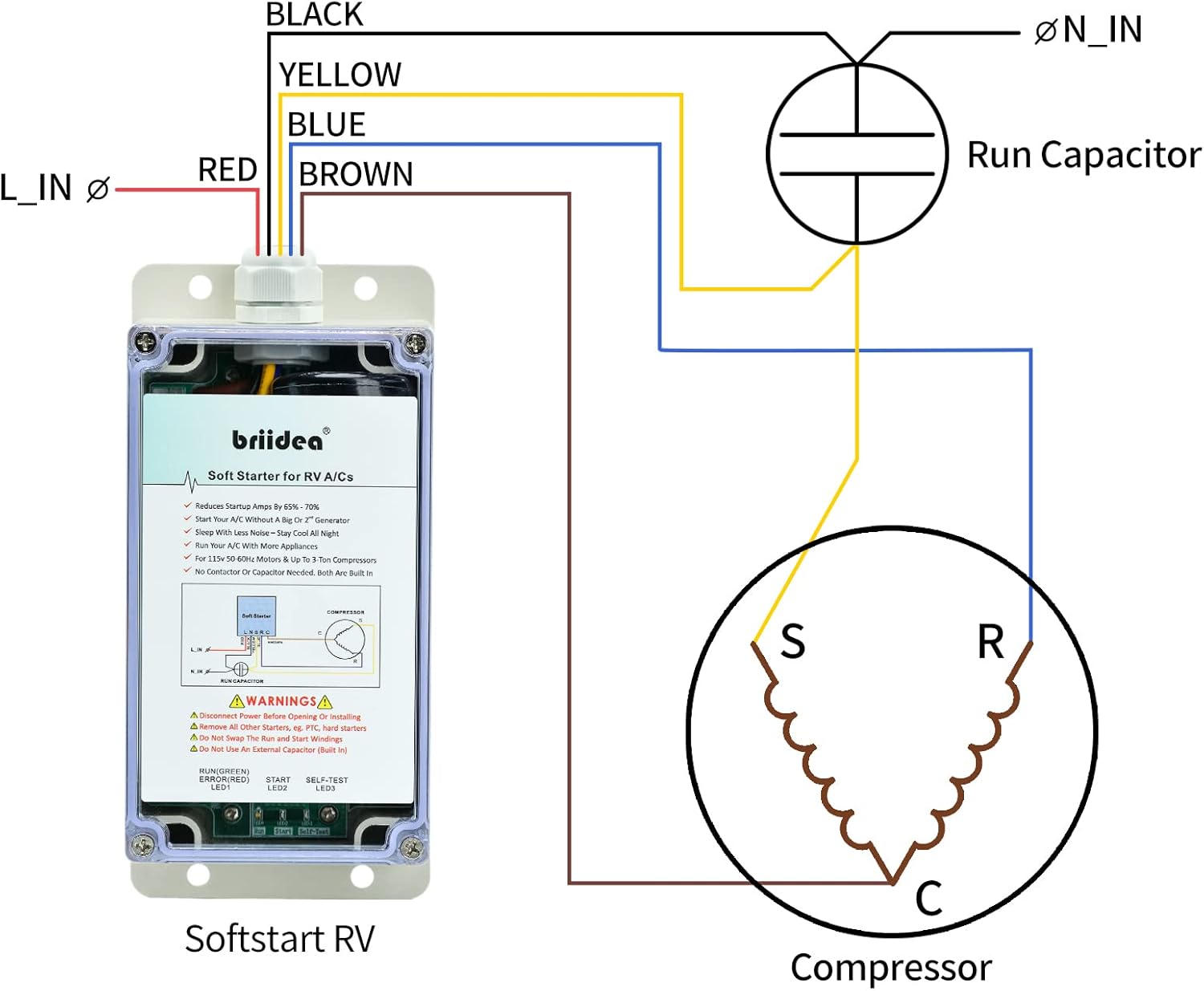 - EASY INSTALLATION: The Briidea soft starter includes a detailed instruction manual that provide effective guidance to help you install it quickly and easily. Additionally, the product's five wires are color-coded for easy identification and connection. It is widely applicable to various air conditioner brands in the market, such as Dometic, Coleman and many others.