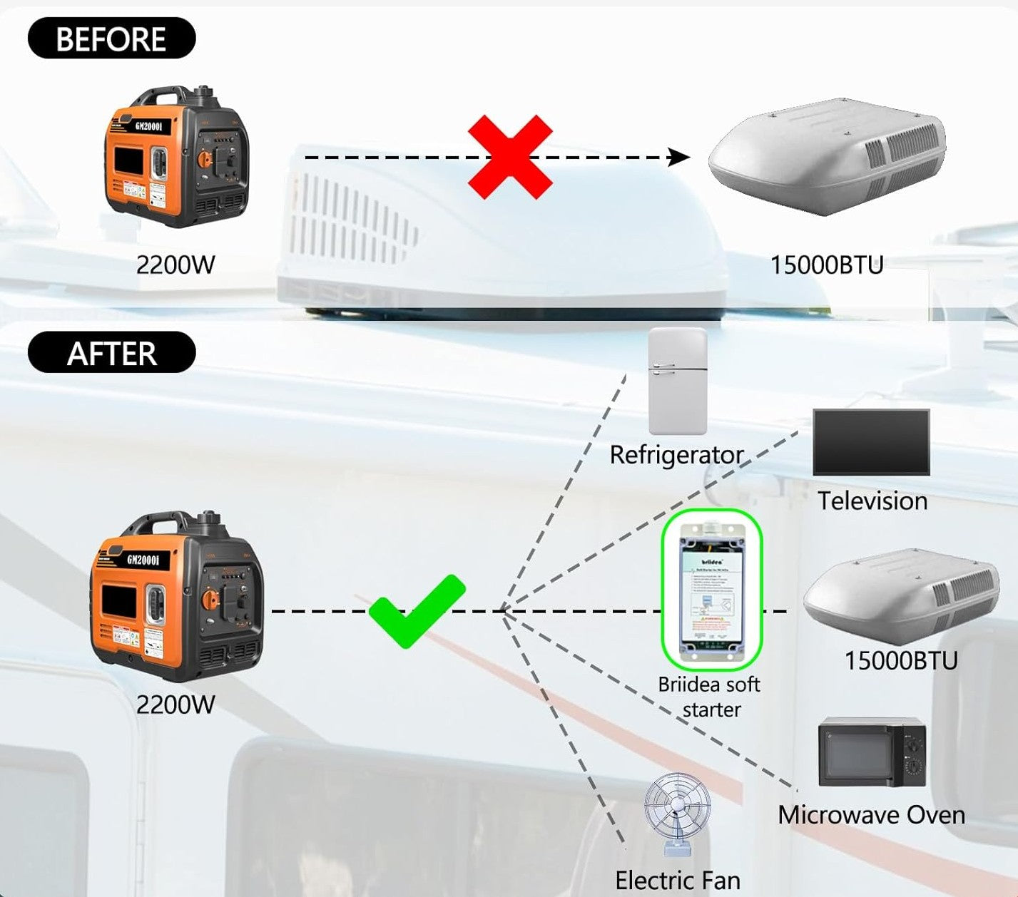 - By installing the Briidea RV air conditioner soft starter, you can start a 15,000 BTU air conditioner with only a 2200W generator, while also powering other appliances such as a refrigerator, heater, microwave, hair dryer, fan, and TV simultaneously.