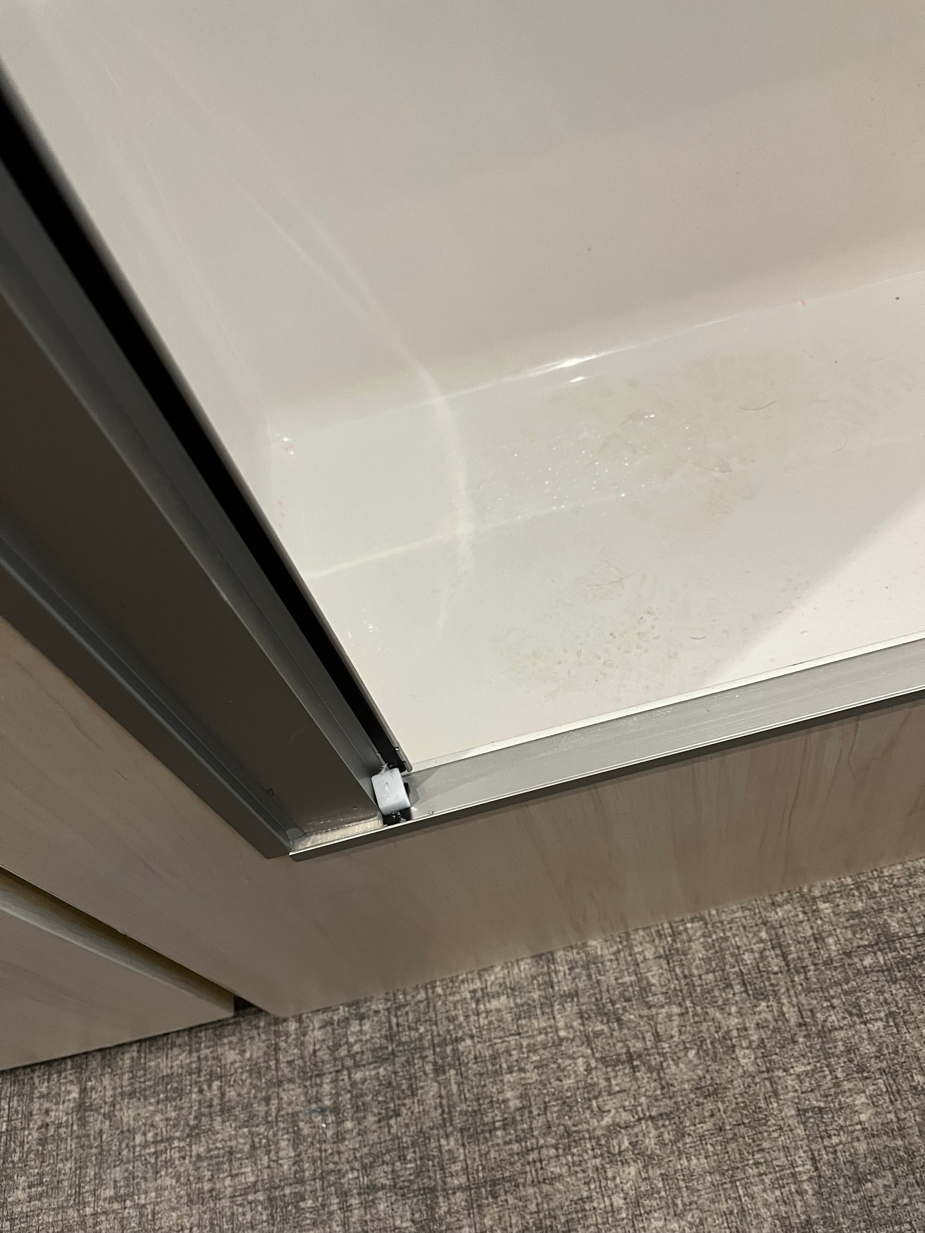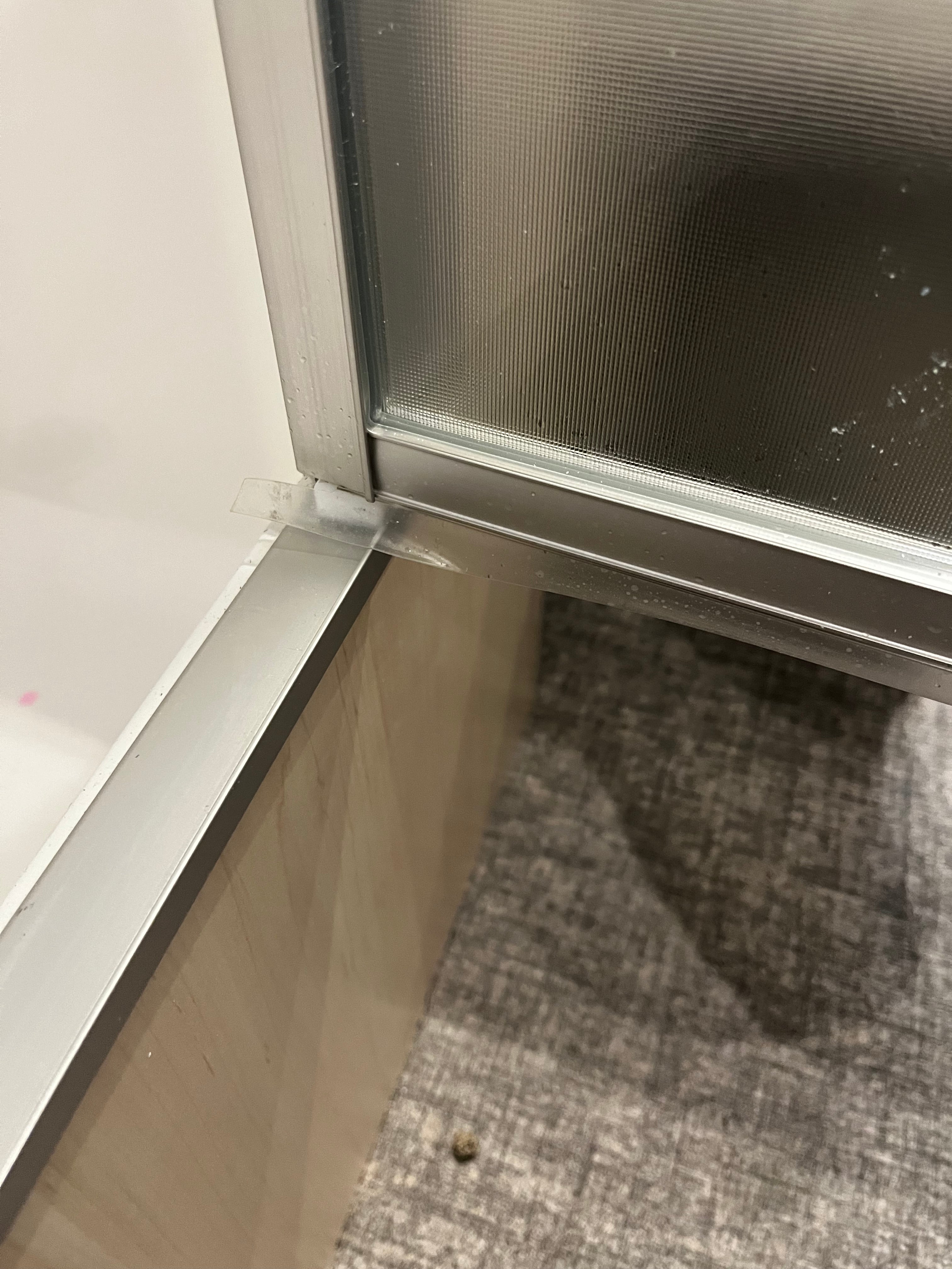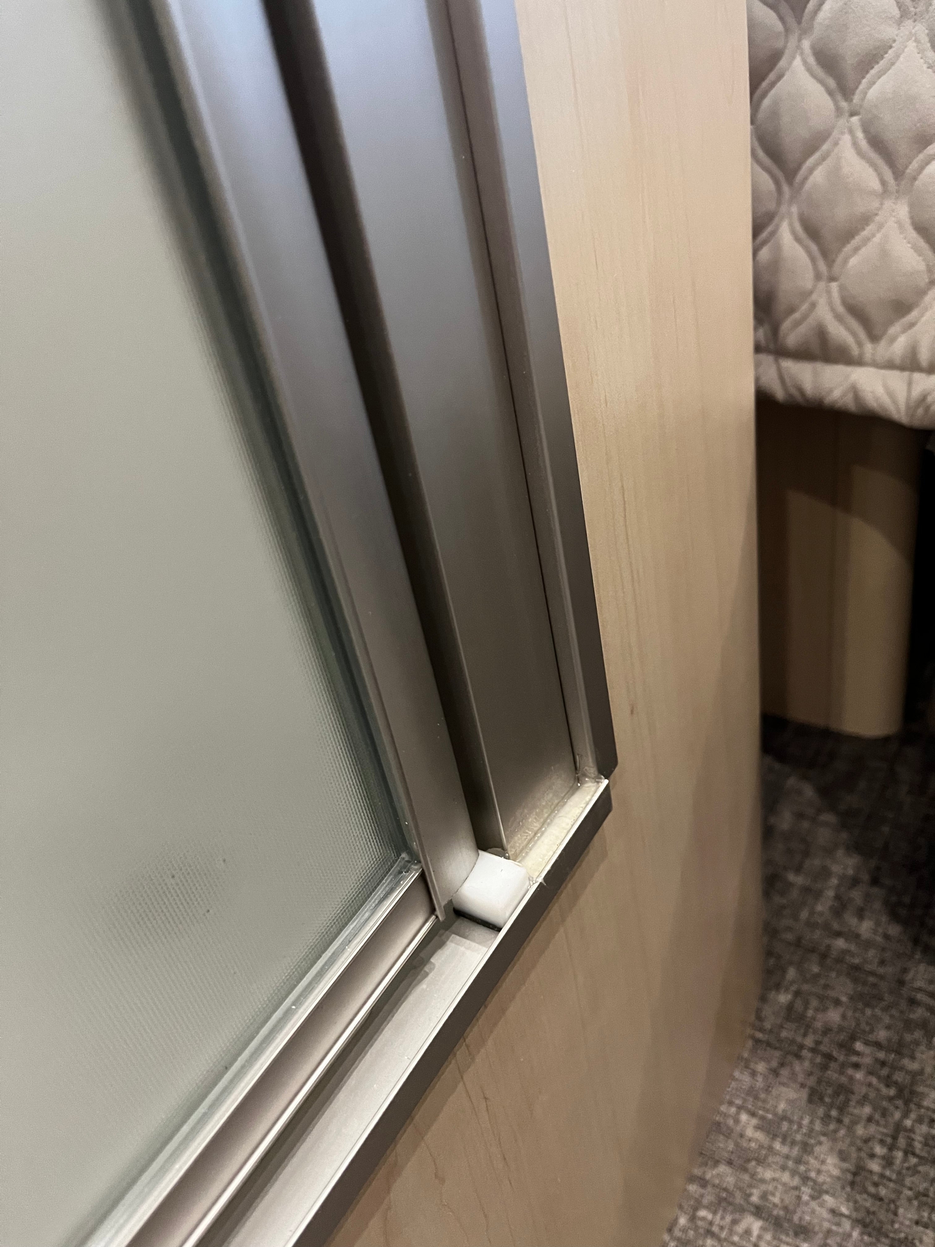 Airstream Spacer Block for Shower Door - 204280 has 3M double adhesive backed tape that can be added to Airstream 703911 Series Shower Doors for a fix to extend the life of Airstream Drip Vinyl Shower Door Sweep - 703911-100 and reduces vibration to the shower door while traveling. Also repairs a sagging shower door due vibration from traveling.