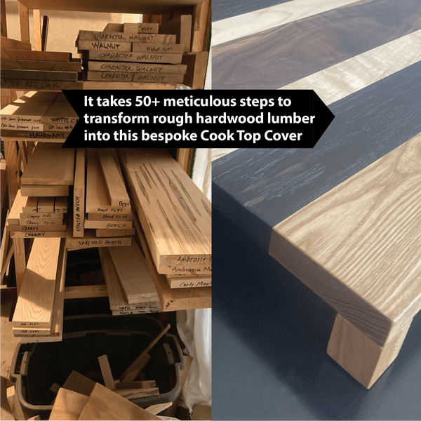 Your unique cover will be created by meticulously joining striking, premium hardwoods. Four round non-skid rubber legs lift the cover to span the glass, never touching it, cover simply rests on the countertop.