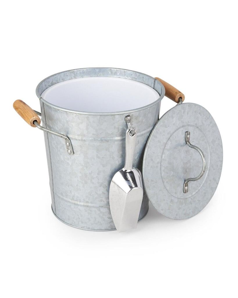Galvanized ice bucket with lid and wood handles, ice scoop included.