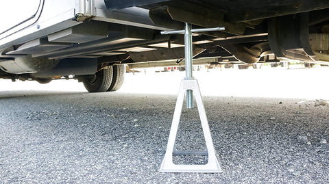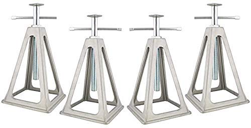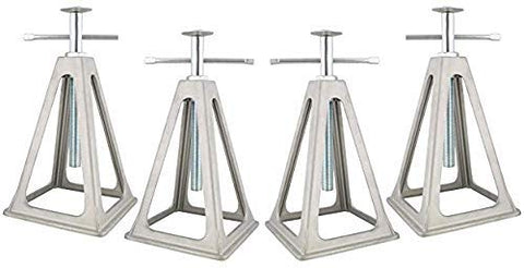 Set of stabilizing trailer jacks (2 Pack or 4 Pack) with 6,000 pound maximum capacity per jack. Constructed of textured cast aluminum to avoid sharp edges. Corrosion-resistant, plated steel hardware. Handles included. Extends 11" to 17".