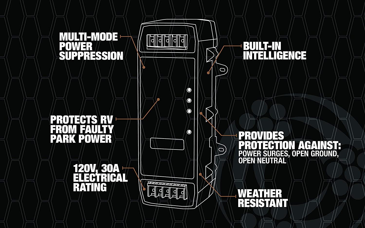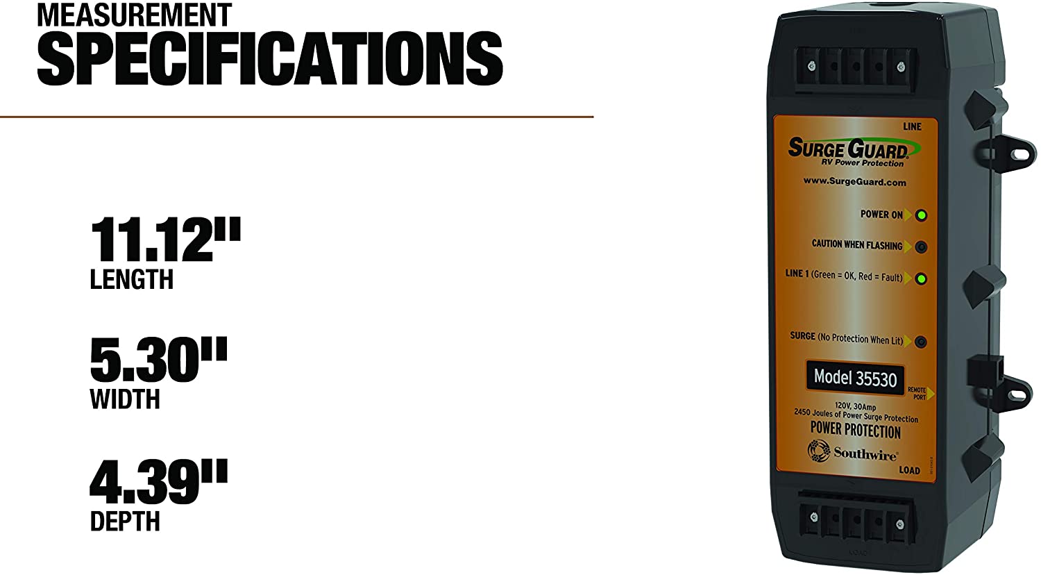 Permanently installed Surge Guard protects your RV bumper to bumper from faulty park power. Protects from the weather and theft and eliminates handling. UL Listed. Automatically shuts off the power when excessive voltage, Low (Less than 102V) and High (Greater than 132V), or open neutral is present. Automatic reset on power restoration. Caution indicator light indicates miswired pedestal, reverse polarity and elevated ground voltage. 128 second reset delay protects A/C compressor. Fits neatly inside RV's electrical compartment. Weather resistant. Joules of surge protection. Easy installation. UL Listed. Optional Remote Power Monitor LCD Display, sold separately. Plugs into remote port on Surge Guard models 34520 and 34560. Conveniently and remotely monitors RV electrical power. Detailed fault screens show 16 information fault screens, incoming line voltages and current being used. Joystick offers easy screen navigation. Stores faults (if any). Plug and Play. Connects to a RJ12 (6 pin) connector cable (included). Not compatible with previous models that do not have a telecon jack.