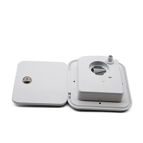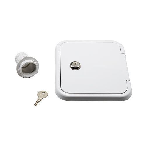 Gravity water fill with tank vent connection and Key Lock, made of durable plastic that can be painted to match any exterior; Accepts 1 1/4" or 1 3/8" water fill hose
