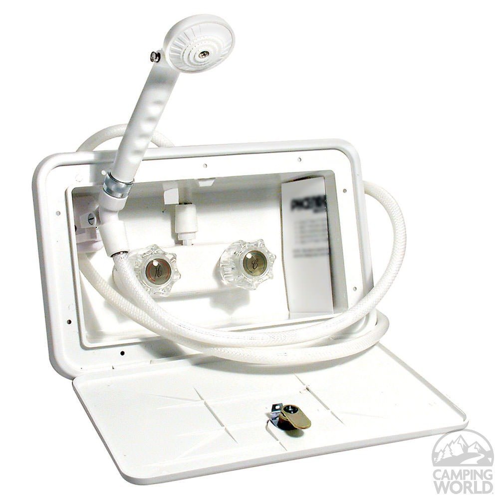 The Phoenix Faucets by Valterra exterior shower provides a gentle shower stream that eliminates the danger of injury from a high pressure hose. It features a hand held or fixed position shower head, quick shut off button, easy grip knob handles, 60" reinforced nylon hose, and a key lock for security.