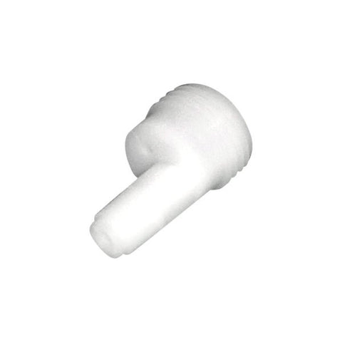 Plastic vacuum breaker with 1/8" FPT inlet and 1/2" straight pipe outlet used for most interior and exterior shower hose connections.