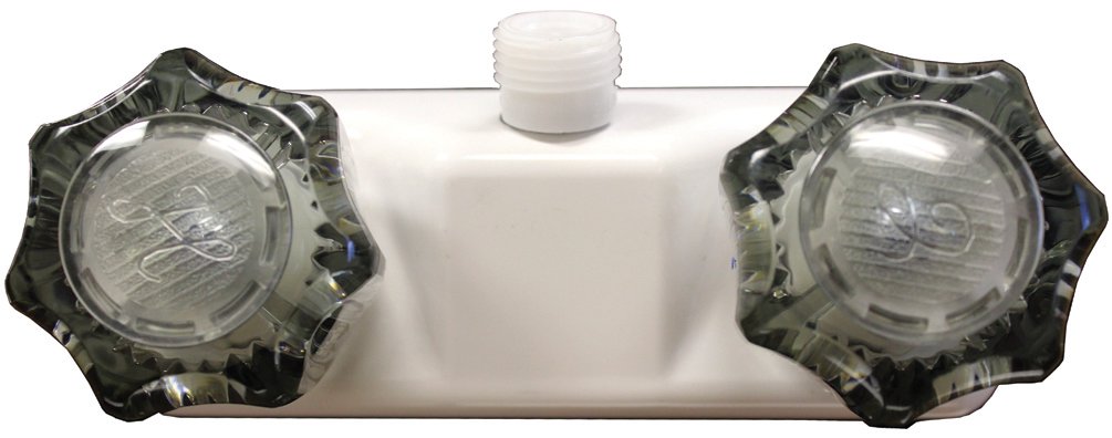White 4" personal shower valve with smoke handles, featuring LaSalle Bristol's patented non-rotating valve stem tip that eliminates washer wear. Single Piece 4 Inch Deck Mount With Shower Valve; 2 Smoked Acrylic Knob Handle; White