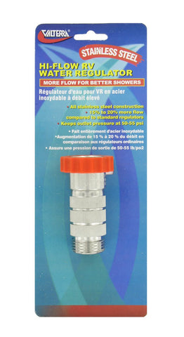 The Valterra Brass or Stainless Steel Water Regulator conforms with federal and state laws for drinking water fixtures, making it the ideal addition to your RV. Water pressure over 55 psi is not recommended.