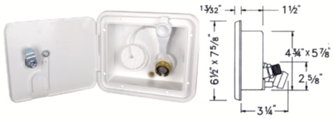 Used For RV Fresh Water System; Gravity Hatch Type; 1-1/4 Inch Or 1-3/8 Inch Water Fill Hose; 4-3/4 Inch Height x 5-7/8 Inch Width Cutout Dimension; 6-1/2 Inch Height x 7-5/8 Inch Width Outside Dimension; 3-1/4 Inch Depth; Polar White; With Tank Vent Connection/ Key Lock
