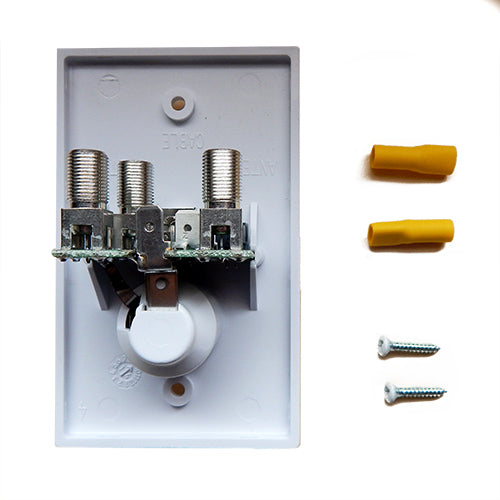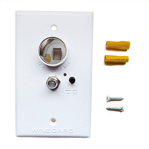 Provides +12VDC to antenna and +12 volt receptacle as well as antenna signals to two TV sets. Cable input from outdoor jack connects to wall plate and may be switched so either antenna or cable signals may be watched. For use with Winegard amplified antenna only.