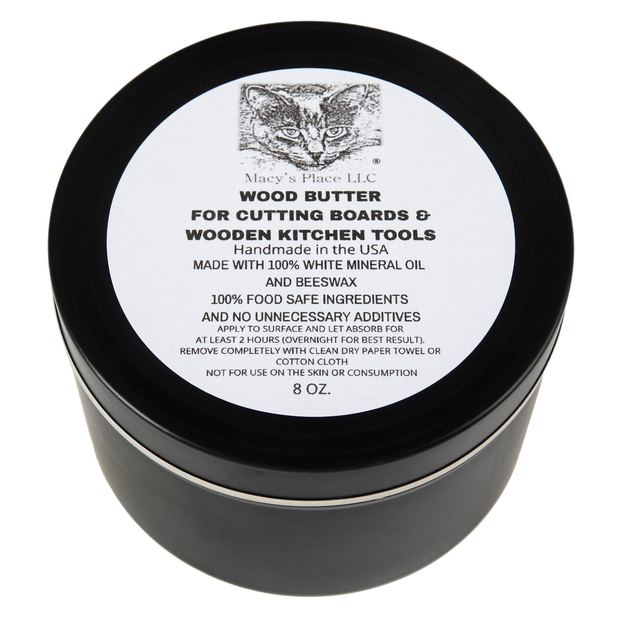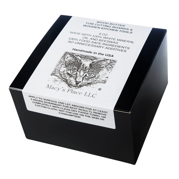 Made by our friends at Macy's Place, a small home business. You'll get a generous 8-ounce tin, enough to restore the finish on several cutting and charcuterie boards, butcher blocks and kitchen tools. Instructions are printed on the container cover.